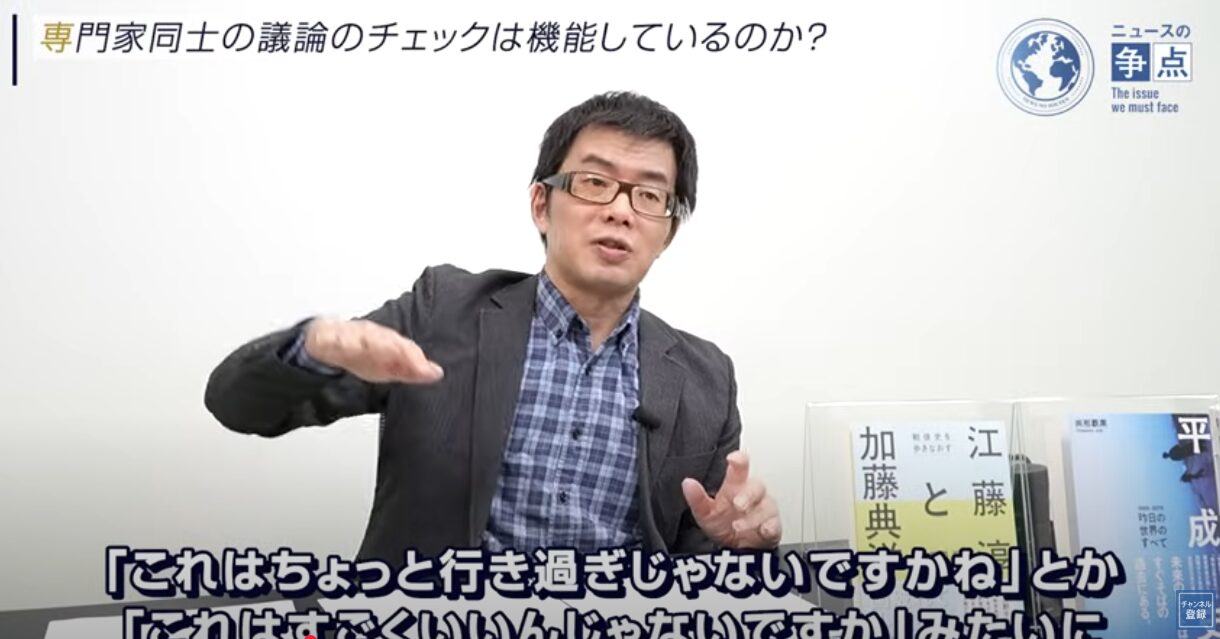 学術界には、学者同士が互いの研究内容をチェックし、品質を保証する「ピアレビュー」という仕組みが「建前としてはやってることになってる」と與那覇氏は説明する。しかし、コロナやウクライナ戦争、パレスチナ紛争といった進行中の問題において、「『私専門家なんです』っていう風に言って出てきた人が後から見ると『え、あれ違ったんじゃないの言ってたことが』っていう風に、それが炎上に発展したりとかね。そういうことってよく起きてます」と指摘。にもかかわらず、学術界内部で「この人の言ってたことのここはすごくいいことだったと。でもここはちょっとグレーゾーンだし、これはやっぱり反省がいるんじゃないかみたいに。例えばそういうシンポジウム、例えばご本人も読んで、ご本人も信頼できるこの人がチェックしてくれるんだったら『なるほど納得できますね。あなたはしっかりした人だから』っていう研究仲間を呼んでやってる例ってあるかっていうとないでしょ」と、学術共同体による適切な「総括」が行われていない現状を批判した。